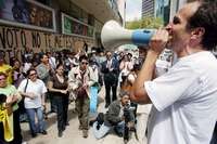 Unas 50 personas, esta vez encabezadas por el actor Daniel Giménez Cacho, entraron ayer en el lobby del hotel Fiesta Americana Reforma coreando "voto por voto, casilla por casilla", y durante una hora marcharon en círculo y repartieron volantes contra el dueño del negocio, el magnate Gastón Azcárraga, a quien tacharon de "delincuente electoral" por haber financiado la campaña de odio de Felipe Calderón Hinojosa en contra de Andrés Manuel López Obrador.