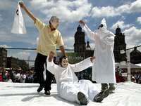 Treinta héroes del pancracio participaron ayer en un espectáculo en la plancha del Zócalo del Distrito Federal, donde se instaló un cuadrilátero que fue escenario de la denominada Lucha por la democracia, voto por voto, casilla por casilla. Allí, en el encuentro especial, El Peje venció a Las Fuerzas Oscuras y todos los deportistas, tanto rudos como técnicos, se dijeron en favor de Andrés Manuel López Obrador, candidato de la coalición Por el Bien de Todos.