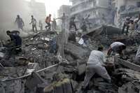 Libaneses buscan cadáveres o sobrevivientes en un edificio bombardeado por aviones de Israel en el sur de Tiro