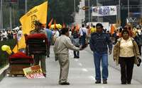 Un organillero y su cooperador en Paseo de la Reforma, ayer durante la marcha hacia el Zócalo para la asamblea informativa convocada por el candidato de la coalición Por el Bien de Todos, Andrés Manuel López Obrador
