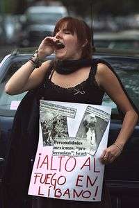 En cárteles portaban leyendas como "Israel: Estado o terroristas", "Alto a la masacre de Líbano y Palestina", "Fascistas, locos, criminales, asesinos" y "¡Ay de aquel que construye con sangre una ciudad y funda un pueblo en la injusticia". Mientras, un joven pintaba en una de las bardas: ''Israel: imperialista'' y ''Los libaneses son seres humanos''. Además, dejó plasmada la frase ''37 niños'', recordando que en un ataque reciente a Qana, murió ese número de infantes.