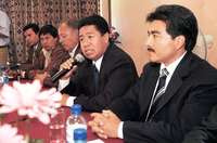 Cinco de los nueve alcaldes panistas que pretenden boletinar a ex burócratas de la entidad que han demandado indemnización por despido injustificado, para impedirles trabajar en el sector público o en el privado. Al micrófono, el presidente municipal de Santa Ana Nopalucan, Felipe Flores, flanqueado por Delfino Suárez, de Tetla, y Guillermo cabañas, de Natívitas