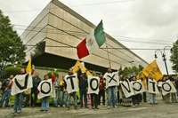 Ante la gran puerta de avenida Universidad, un grupo de sindicalizados denunciaba las injusticias que padecen los empleados de base. "Este año, Bancomer no dio reparto de utilidades; nos dio un préstamo (hasta de 120 mil pesos por cabeza), pero nos quitó el IVA y nos lo cargó a la nómina para irnos descontando como si fuera tienda de raya. Estos españoles creen que estamos en tiempos de la Colonia, son unos negreros. Por eso apoyan a Calderón, qué bueno que vinieron, compañeros, hay que seguir luchando", expuso un hombre de mediana edad entre muchas otras voces.