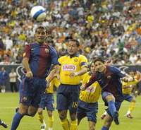 Houston, Texas., 9 de agosto. El Barcelona recurrió a la magia de Ronaldinho para sacar el partido del congelador y con tres goles en los últimos 10 minutos del partido sacó un sensacional empate de 4-4 contra el América de México, en el amistoso jugado en el estadio Reliant de Houston, ante más de 70 mil personas.