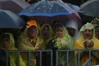 Empapados, simpatizantes de Andrés Manuel López Obrador escuchan los acuerdos tomados en la asamblea informativa realizada en el Zócalo de la ciudad de México