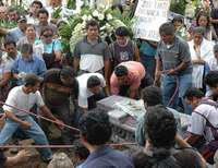 Familiares, amigos y maestros despiden a José Jiménez Colmenares, quien fue baleado el jueves pasado durante una marcha convocada por el movimiento magisterial oaxaqueño