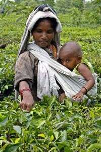 Ampliar la imagen Una mujer recolecta hojas en una plantación de té, mientras carga a su hijo de un año en la ciudad de Siliguri, en India Foto: Reuters