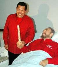 El presidente de Cuba, Fidel Castro, apareció este lunes en una serie fotográfica del diario oficial Granma en su lecho de enfermo con el mandatario de Venezuela, Hugo Chávez, festejando su cumpleaños número 80. "Fue una reunión que dio aliento al aguerrido comandante de mil batallas", señaló el rotativo