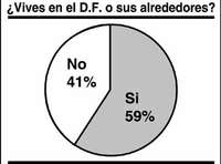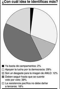 ¿Era apropiado preguntar su opinión acerca de los campamentos a personas que no viven en el Distrito Federal y sus alrededores y, por tanto, no han tenido una experiencia directa con la resistencia civil? Después de dar vueltas al asunto pensamos que sí. Aunque no vivan aquí es válida su opinión. Sólo 51 por ciento de las 2 mil 705 personas cuya opinión sondeamos -por correo electrónico- entre el domingo y ayer, vive en la capital del país, el resto reside en otras partes de la República, inclusive en el extranjero. El 39 por ciento -locales y fuereños- simpatiza con la idea de que continúe el plantón en el Zócalo y Reforma; 2 por ciento dijo que ''ya basta de plantones'', y el resto matizó su posición con distintos enfoques. Ver gráficas.