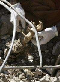 Voluntarios de la Cruz Roja remueven las joyas del cuerpo de una mujer encontrada en un edificio destruido por la aviación israelí en el poblado de Ainata, en el sur de Líbano, para que familiares puedan proceder a identificar los restos rescatados FOTO Ap