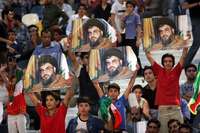 Iraníes apoyan al líder de Hezbollah, Hassan Nasrallah, ayer en Teherán en el partido de futbol entre Irán y Siria
