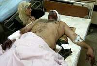 Una iraquí cuida en el hospital de Bagdad a su esposo herido por un atentado explosivo en un mercado de la capital nacional * Reuters