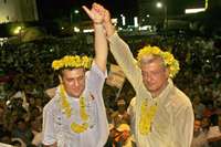 Juan Sabines, aspirante de la coalici�n Por el Bien de Todos a la gubernatura de Chiapas, y el candidato presidencial Andr�s Manuel L�pez Obrador, durante el cierre de campa�a en el parque central de Tuxtla Guti�rrez FOTO V�ctor Camacho