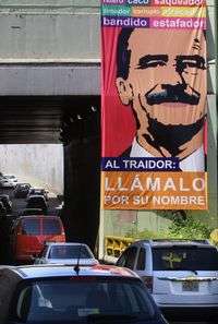 Desde la mañana de ayer el rostro del presidente Vicente Fox aparece en una gran manta que cuelga en el paso a desnivel de la avenida Chivatito, donde cruza con el Paseo de la Reforma, acompañado de la leyenda: "Al traidor: llámalo por su nombre", en alusión a las palabras del candidato de la coalición Por el Bien de Todos, Andrés Manuel López Obrador, quien en reiteradas ocasiones ha afirmado que el mandatario traicionó a la democracia.