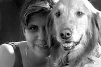 Arriba, Erika, una de las orientadoras de la muestra, con su perra-guía Lindi