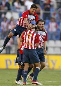 Jugadores de Chivas celebran el segundo gol para su causa, conseguido en los momentos finales del encuentro por la vía del autogol