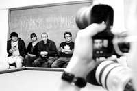 El director de fotografía Guillermo Granillo, la maquillista Regina Reyes, el director Daniel Gruener y José Luis Aguilar, quien participó en el diseño de la producción, durante el pizarrazo inicial