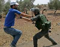 Un activista palestino que participaba en una protesta contra Tel Aviv es reprimido por un policía fronterizo israelí, ayer en Bilin