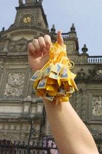 Simpatizantes del candidato de la coalición Por el Bien de Todos, Andrés Manuel López Obrador, ofrecían escapularios de San Peje frente a la Catedral Metropolitana