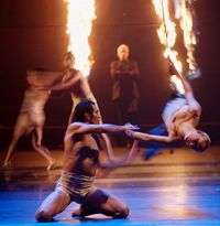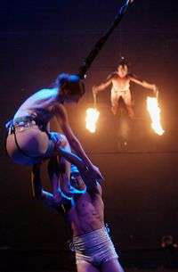 Desafío a la ley de gravedad: flotan ligeros, suspendidos con la ayuda de arneses, en evoluciones en momentos acaso circenses, por antonomasia, sorprendentes. Dúctiles, sus cuerpos confrontan los límites de la anatomía humana, lo mismo en contorsiones que en derroche de fortaleza.