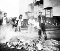 Chilpancingo, Gro., 30 de agosto. Maestros disidentes quemaron hoy en la explanada del Congreso local 350 libros de historia, geografía y civismo en protesta porque, argumentaron, no hubo una auténtica consulta a maestros y padres de familia sobre la reforma a la educación secundaria (RES).