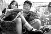 Un padre comparte el gusto de la lectura con su hija, en la Feria del Libro de Guadalajara, en 2002