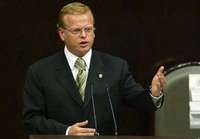 En la imagen, el senador Arturo Escobar y Vega, quien planteó la postura del PVEM. Más tarde, los legisladores del PRD tomaron la tribuna e impidieron que el presidente Vicente Fox leyera su mensaje en el Palacio Legislativo de San Lázaro
