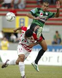 Jorge Campos, de Santos, despeja ante el acoso del delantero teco Francisco Bravo, quien anotó dos goles en el partido
