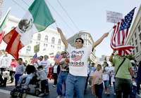 Un manifestante sostiene las banderas de México y Estados Unidos, durante la marcha que se realizó ayer en el centro de San Francisco en reclamo de amnistía para trabajadores indocumentados en ese país. Marchas en favor de los derechos de inmigrantes se observaron en distintas ciudades a lo largo de todo el territorio estadunidense