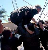 Néstor Kirchner, presidente de Argentina, es auxiliado por sus guardias de seguridad para saltar un alambrado luego de inaugurar en Corrientes, unos mil kilómetros al norte de Buenos Aires, un proyecto de viviendas subvencionadas