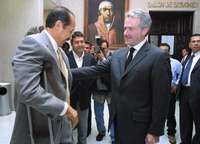 Los senadores Leonel Godoy, del PRD, y Santiago Creel, del PAN, en el vestíbulo de la casona de Xicoténcatl