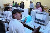 Aspecto de las actividades en el centro de registro de delegados a la convención nacional democrática ubicado en la explanada del Zócalo