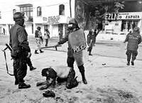 Un ejidatario de San Salvador Atenco es golpeado frente al palacio municipal, durante el operativo policiaco del 4 de mayo