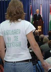 Una joven se presentó en la rueda de prensa que dio ayer el primer ministro Tony Blair, en Ramallah, con la leyenda: "Me avergüenza ser británica" en su playera