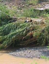 El cuerpo de un hombre yace sobre unas ramas junto al arroyo San Martín, ubicado en el noroeste de Monterrey, Nuevo León. La víctima fue arrastrada anoche por la corriente, debido a las fuertes lluvias que azotaron la zona metropolitana