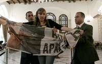 Una pacifista irlandesa, Caoimhe Butterly, desplegó hoy una pancarta ante Blair y Siniora, en la que demandó "Sabotaje al apartheid israelí", al tiempo que le gritó: "deberías estar avergonzado". Agentes de seguridad intervinieron de inmediato para retirar a la mujer, que todavía alcanzó a decir: "esto es un insulto a miles de libaneses que han muerto como resultado de las políticas de Blair".