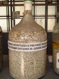 Garrafas que contienen nódulos de la oncocercosis extirpados principalmente de cabeza, hombros y espalda a pacientes de la región de Huixtla