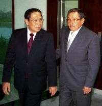 Foto del periódico Granma donde se ve al presidente interino, Raúl Castro (derecha), de civil junto al mandatario de Laos, Choummaly Sayasone