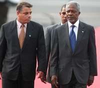 El canciller Pérez Roque recibe en el aeropuerto de La Habana al secretario general de la ONU, Kofi Annan