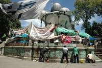 Integrantes de la APPO realizaron ayer labores de limpieza en los edificios y monumentos del Centro Histórico de Oaxaca, además de crear murales alusivos a la Independencia de México, con motivo de las fiestas patrias