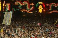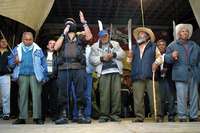 San Salvador Atenco, Mex., 15 de septiembre. Al grito de: "¡Presos políticos, libertad!", el subcomandante Marcos encabezó en los primeros minutos de este sábado la ceremonia del Grito de Independencia en la plaza principal de San Salvador Atenco, acompañado por cientos de campesinos del Frente de Pueblos en Defensa de la Tierra (FPDT).