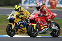 El italiano Marco Melandri (derecha), en duelo cerrado compite con su compatriota, el campeón Valentino Rossi, durante el Gran Premio de Motociclismo, que tuvo lugar en Phillip Island, cerca de Melbourne