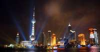 Exhibición de luces desde los botes que recorren el río Huangpujiang en Shanghai, China, para celebrar el comienzo del Festival del Turismo
