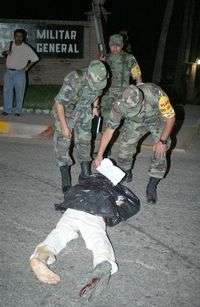 Militares observan el mensaje que desconocidos dejaron en el cadáver de un hombre ejecutado y abandonado a la entrada de la novena zona militar. El letrero decía: ''Por dedo... Eddie'', en aparente referencia al comandante Rolando Eugenio Hidalgo Eddie