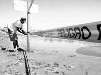 Un trabajador coloca señalamientos de advertencia por contaminación en una playa de Boca del Río