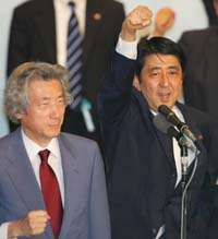 Shinzo Abe celebra el apoyo liberal. A la izquierda, el primer ministro Junichiro Koizumi FOTO Ap