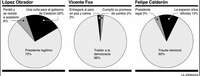 Esta semana el país se topó con una situación inédita: tres presidentes. Uno, Vicente Fox, el constitucional, ya dijo que bajó la cortina; otro, Felipe Calderón, reconocido por el TEPJF, todavía no la abre, y Andrés Manuel López Obrador, candidato de la coalición Por el Bien de Todos, resultó nombrado 'presidente legítimo' por una multitud constituida en asamblea nacional democrática. AMLO tiene la cortina abierta día y noche pero carece de cualquier tipo de facultades legales. ¿Qué piensa la ciudadanía? ¿Cómo está procesando esta situación sin precedente? Al presidente Fox, una gran mayoría de las 3 mil 263 personas -mujeres y hombres- cuya opinión sondeamos, lo percibe como un "traidor a la democracia"; a Felipe Calderón lo asocia con "fraude electoral" y muchos opinan que le esperan "años difíciles" y a AMLO algunos lo ven como "presidente legítimo", pero un importante porcentaje simplemente lo considera una "cuña" para el futuro gobierno.