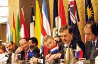 Los ministros de Comercio de Australia, Mark Vaile (segundo de izquierda a derecha), y de Nueva Zelanda, Phil Golf (tercero de izquierda a derecha), escuchan el final de una conferencia de prensa ofrecida ayer en el contexto de la reunión del Grupo Cairns en Australia