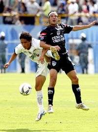 Pese a la derrota, San Luis sigue a la cabeza del sector dos, con 14 puntos, mientras Tuzos llegó a 13 unidades. En la imagen, Israel Martínez lucha por el balón con Gabriel Caballero (derecha)