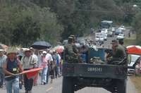 Apenas se dejó la comunidad, a lo lejos un Hummer del Ejército Mexicano apareció con unos 12 elementos a bordo. La inesperada presencia provocó tensión, pero nada pasó, pues los caminantes actuaron mesuradamente y en vez de insultarlos o agredirlos gritaron su característica frase para agradecer el respaldo popular: "¡Ese apoyo sí se ve, ese apoyo sí se ve!"